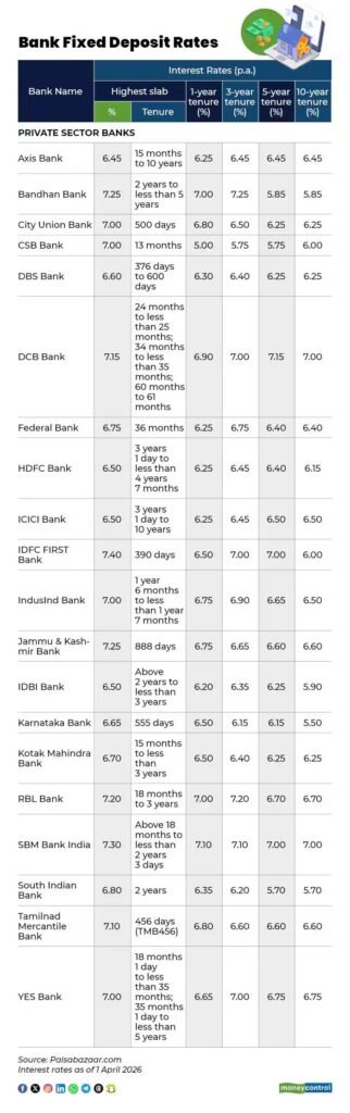 With changing economic conditions and RBI policy impact, Fixed Deposit (FD) interest rates have seen notable variations across banks. As of April 2026, private sector banks are offering competitive rates, making it important for investors to compare before investing.